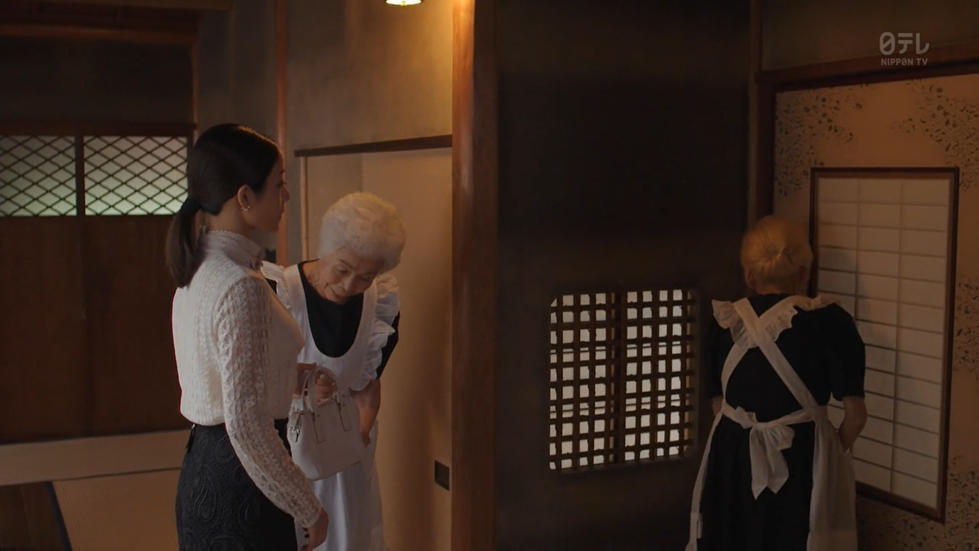 她闲庭漫步,不慌不忙。目光看着庭院就像主人看着自己的所有物一样。十元在此处一直是高昂这头颅,和女佣们说话也是短短的回头低下了瞬间便立刻转回继续抬高头颅,骄傲的向前走着毫不在意。女佣们以她的夸奖为荣。进入屋子前这一段也是无可挑剔,十元饰演的桃直到这个时候都能非常明显的表现出了高傲和贵气,不用正眼去看,仅仅是把包在手边挂起等待着女佣来收,这里也和前面自行车店里桃下意识等待他人服务的行为相符合。