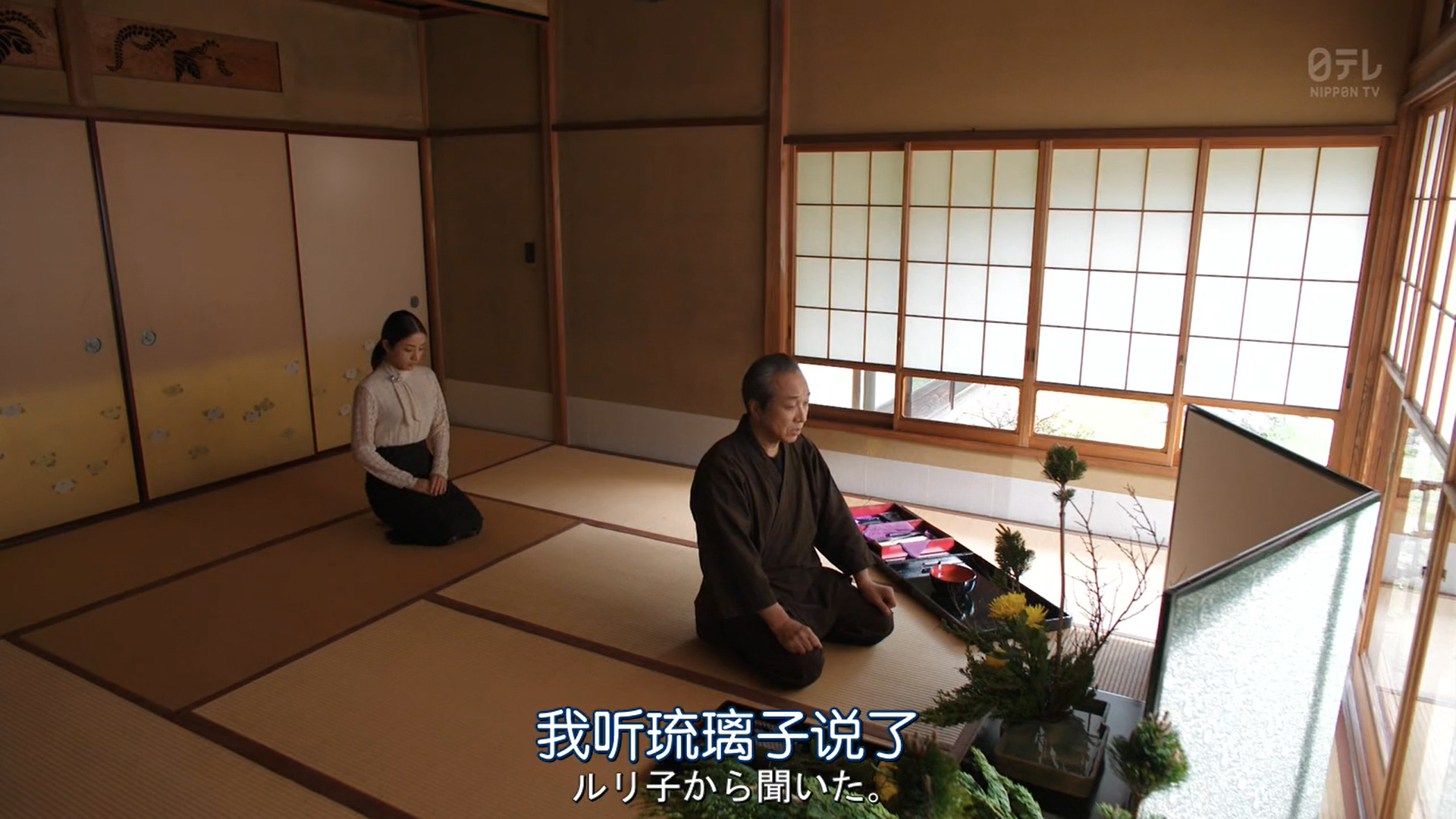 接着桃开始眼光偏移向右边,实际上仔细注意的话我们可以发现,父亲右边正是他刚刚完成的插花作品。从小浸淫学习插花的桃不自觉的会想去观察评鉴他人尤其是父亲的插花作品这点就很好表现出来了