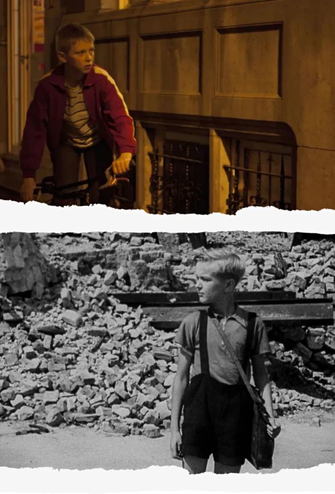 事实上,在法国媒体《电视全览》(Télérama)组织的一次投票中,达内兄弟选择的第一部影片便是罗西里尼的《德意志零年》(Germania anno zero)。如上所述,二者在美学上有非常接近的一面,尤其当我们将《单车少年》、《年轻的阿迈德》与《德意志零年》放在一起进行比对时便可以发现,二人对罗西里尼美学上(甚至情节上)的参照是极其明显的——西里尔和阿迈德孤独地四处游走,不正对应着埃德蒙在战后德国断壁残垣里的逡巡吗?二人的坠落,不也正是埃德蒙坠楼的变体吗?