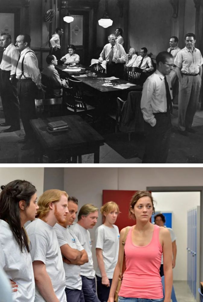 而在这之中,自始至终没有改变的是对身体性的关注和呈现,哪怕是在职业生涯后期最大胆的、结构性的尝试《两天一夜》(Deux jours, une nuit)里——二人让主角不断重复地去寻找自己的工友,一次次地、面对面地向他们解释自己的处境。无数次的复沓之下,女主角(玛丽昂·歌迪亚饰)找到了某种价值,甚至缓缓疗愈了自身的焦虑,最终实践了一种对他者的责任。这种加缪式的举动让人想起吕美特的名作《十二怒汉》,也无疑让人一再回忆起达内兄弟影像中那些坚定地寻求生活可能的普通人。
