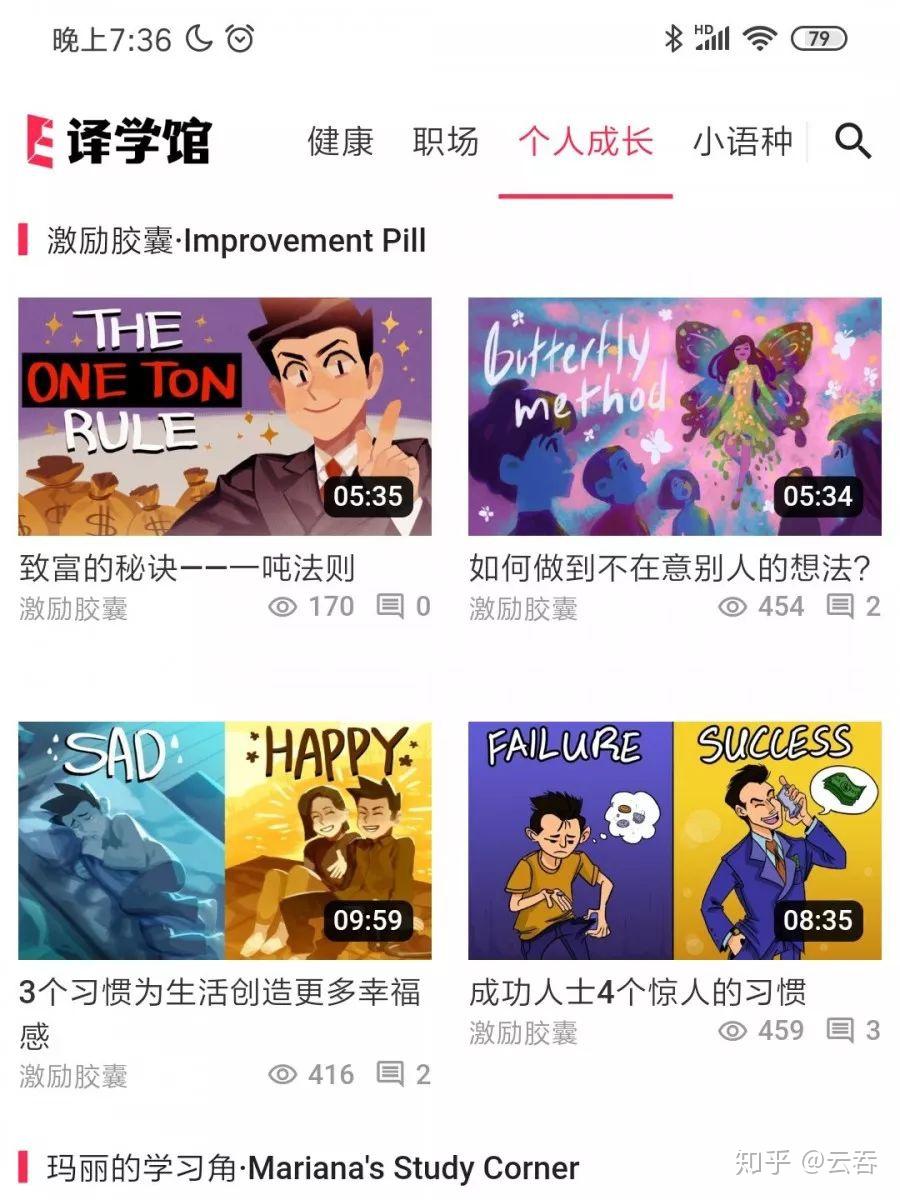 第三个想推荐的APP,译学馆。其实这个APP本来是我备考翻译证的时候用的,但是我觉得也很适合喜欢看视频学习口语的朋友,因为里面有很多优秀译者提供翻译字幕的视频,内容也很丰富,囊括TED,科学,教育,旅游,商业,社会和时尚等等。