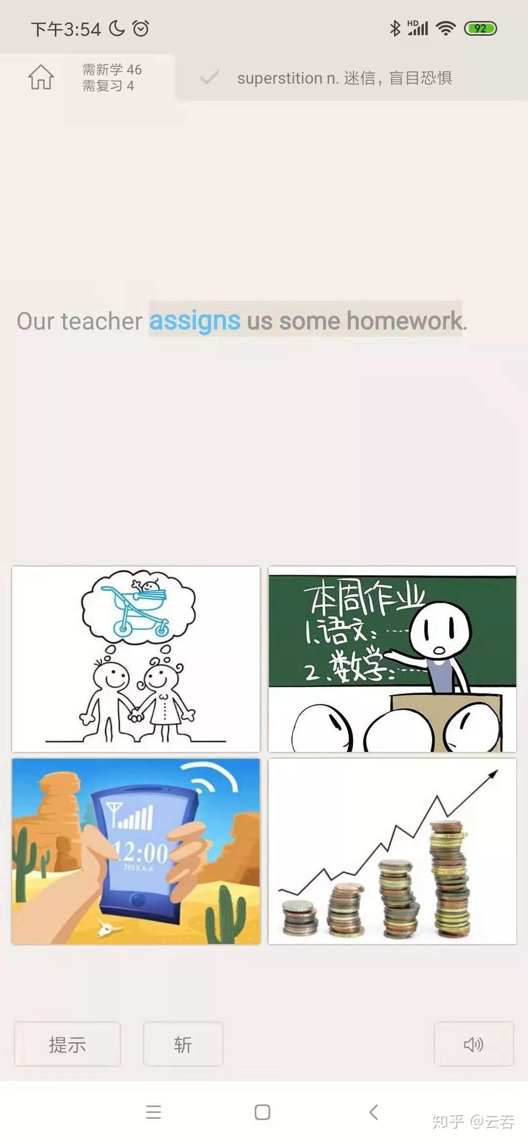 因为这种东西看完就忘而且很没意思极度无聊。我也会和很多人一样,永远都是停留在A开头第一页的几个单词。可是单词还是要记呀,英专生也逃不过要记单词这个事实,每次考证也肯定是要恶补单词的。我恶补单词的方法就是用百词斩APP,这是我用过的最好的记单词APP了,图文并茂,声色并茂,大爱呀我很喜欢里面的记单词形式,好似在闯关答题一样,而且里面的图片有挺多与时俱进的梗。里面的人朗读那个例句也有点搞笑,例如读打呼噜这个单词,他读完会拟声出抽风机似的鼾声,让你突然对这个单词印象深刻或者忍不住对这波操作笑出来。可以自己定计划,例如每天我就记50个单词,然后会生成图片打卡。?