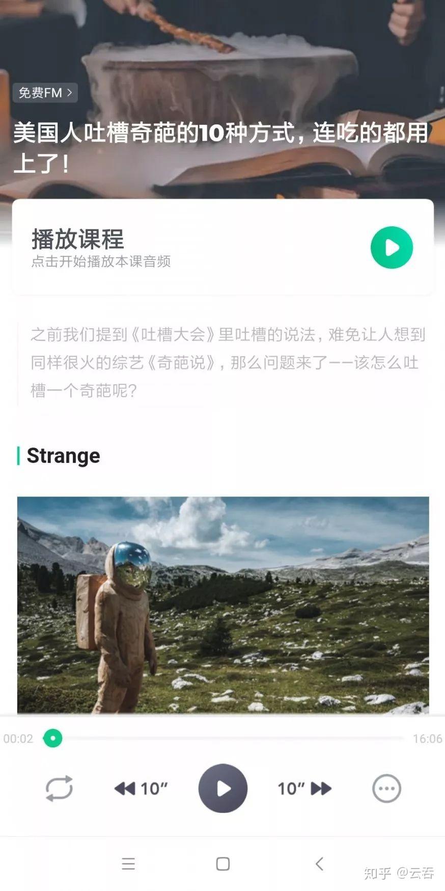 第二个我想推荐的是开言英语,开言英语里面我每天清晨都会听一期开言FM(潘吉Jenny告诉你)。里面的主播都超级喜欢呀,觉得他们很幽默。每一期都有一个topic介绍怎么说地道英语,例如外国人是怎么说goodbye的,美国人吐槽奇葩的10种方式,英语怎么说倒霉的?每一期大概有10几分钟,每一期都会有两位主播讲解,听他们说说笑笑讲地道的口语表达很有意思,不知不觉就学到了很多。里面也有很多付费课程,有条件的朋友可以订阅自己想要专攻提升的课程哈。