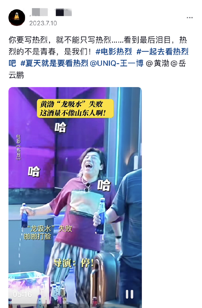 犹记得电影《热烈》在公开幕后花絮的时候,黄渤在旋啤酒的过程中,因为没忍住,一口喷了出来,引得现场工作人员哄堂大笑,如今这个面子在夜市上自然要争回来。