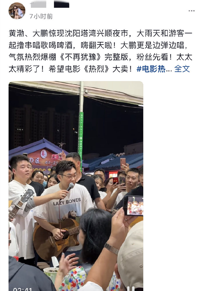 据网友透露,两人现身的具体地点位于沈阳塔湾兴顺夜市,当晚的天气并不是很好,但现场的氛围却非常浓烈,尤其是大鹏,不仅手拿吉他全程弹唱,而且状态非常燃,好似他原本就是这个夜市的一份子。