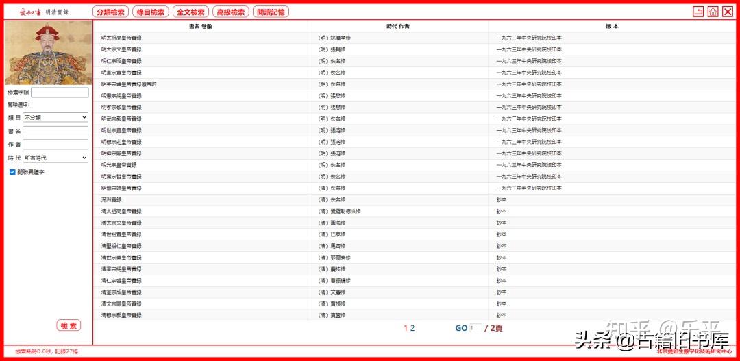 爱如生明清实录所收《明实录》,包括明代官修的太祖至熹宗的十三朝实录,以及后人补辑的崇祯朝实录,凡14种2,923卷;所收《清实录》,包括清代官修的满洲实录和太祖至德宗的十一朝实录,以及后世补纂的宣统政纪,凡13种4,433卷。二者合计共27种、7,356卷。毫秒级全文检索,另提供分类检索、条目检索、高级检索等多种检索方式。