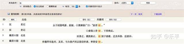 在查询字词的使用情况时需要用到语料库。国家语委古代汉语语料库检索结果包括朝代、出处和关键词所在句。