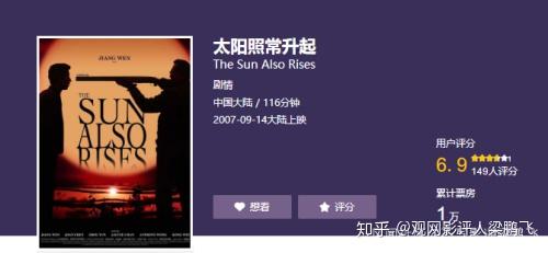 比如姜文的《太阳照常升起》,在作为大众观影口味代表的猫眼上,只有6.9分。当然这也是因为打分人数太少,可能不是太有代表性。