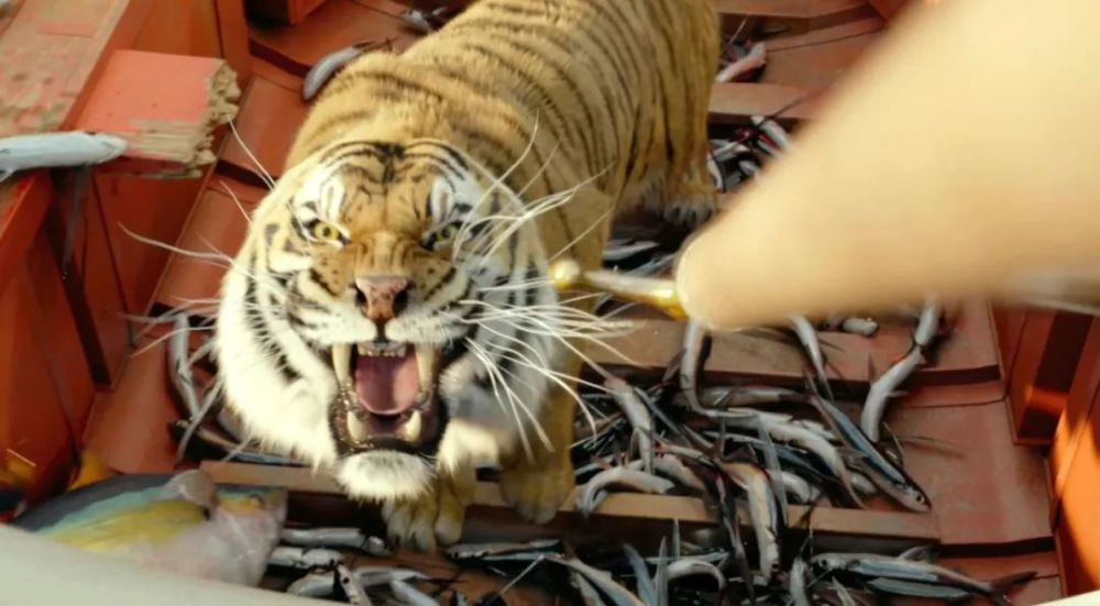 在海上遇难不久,Pi很快就醒悟自己只有“驯服”老虎这个选择,否则必死无疑,因此他凭着机智取得了人虎关系中的主控权:供应水与食物,并且搭配他身为动物园园长儿子拥有的所有知识——关键在于,他要驯服的对象正好也是一只在动物园中长大的老虎,在人与动物权力角力的这场战役中,它一开始就输在起跑点上:“理查·帕克从记事以来就是一只动物园里的动物,它习惯了茶来伸手饭来张口。……我的作用十分简单也十分神奇,因此我也就产生了权力。”但是,由于《少年Pi》并不是一个描述某种“人定胜天”式的、“人类凭借着不屈不挠的毅力克服了自然与力量强大的动物”的典型叙事,它不是《老人与海》(The Old Man and the Sea)的少年海难版——尽管老人确实也对他所要战胜的那条大马林鱼产生了某种认同与情感;但是Pi并不是怀抱着要成为“海上驯兽师”的目标来到救生艇上的,因此他对老虎的情感相对也就更加复杂。