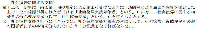 4.第13条规定:经访问等确认信息属实之后,对登记者实施回归社会支援。但是,在实施支援时需注意不要让邻居和其他人知道。