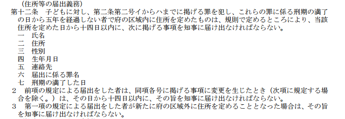 3.第12条规定:对儿童实施性犯罪的、刑满日期起至今未超过5年的、居住在大阪府的性犯罪者,有义务如实向知事申告并登记如下内容:姓名—地址—性别—出生日期—联系方式—罪名—刑满日期。信息变动需要在14日以内申告;搬出大阪府也需要申告。