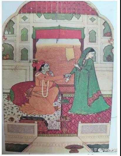 《欲经》的作者筏磋衍那,是性学领域的开山鼻祖,他在前人总结理论的基础上加以整合,写成了这本性学方面的基础权威著作。在这本书中,欲与法(美德)、利(利益)并称为人生最重要的三件事,欢愉之事属于每一个人,不仅仅是富人、高贵者独有的,尽管在书中第一章,作者还是把《欲经》的受众群体下意识指向了城里的纨绔子弟。因为成书时间和背景的限制,该书主要还是以男性视角为主,对女性的指涉比较有限,不过书中在描绘男女性爱细节时,并没有将女性刻意矮化,而是强调男性应当尊重伴侣的感受,性爱过程应当是双方平等、满意且愉快的。该书分为七个部分,分别是总论、求爱、结婚、为妻之道、他人之道、名妓和秘传经验,书中除了细致讲解了多达64种性爱姿势,还描述了与之相对应的男女应当学习的64种技艺(64是古代印度比较喜欢的数字,类似中国的3、6、9),因为复杂高技巧的性爱姿势和艺术一样精彩,甚至比艺术更能传递快乐。作者还不厌其烦地勾勒出一个具有品位的富裕子弟应该过怎样的生活,细节详细到房间物件的摆放、对女性应该讲的话和态度,鲜花、香水、轻柔的细语必不可少,活脱脱一本高级撩妹指南。另外,书中还发表了作者对于婚恋、婚姻、同性之间感情等在内的种种性学现象行为的看法,由此向我们传递出印度笈多时期的社会思想状况。印度细密画,女子与她的倾慕者。翻拍自丁一:《古印度生活》,汕头大学出版社,2009年。