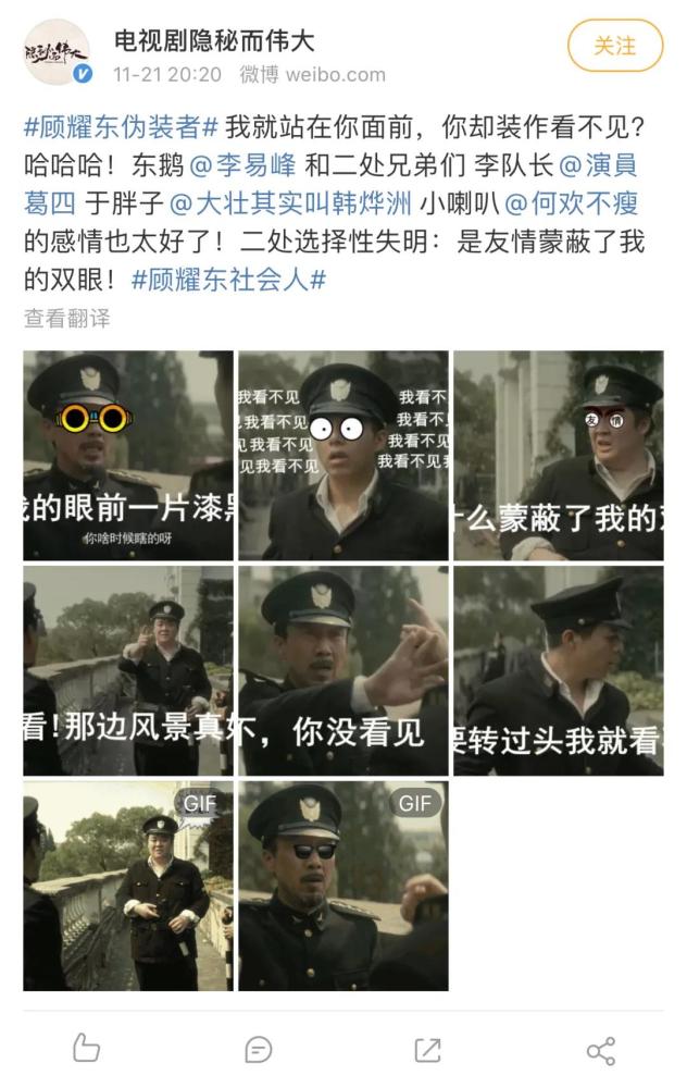 《隐秘而伟大》的官方微博、演员微博里,尽是配合网友娱乐的内容。东鹅、可达鸭等代号运用娴熟,“隐秘人,伟大魂,你我都是追剧人”等具备网感的语句也信手拈来。