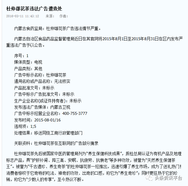 答案显而易见。早在2016年,有关杜仲雄花茶的广告违法宣传就遭到了内蒙古食药监局的查处。在被公示出来的有关杜仲雄花茶的违法广告部分摘录中,我们可以看到,该广告所使用的宣传口吻,几乎与孚元吉官网的宣传话术一模一样,都宣称该产品具有“护肝补肾、降三高、安眠”等诸多功效。
