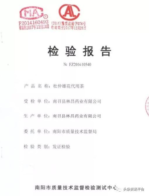 话说回来,由孚元吉公司销售的这款杜仲雄花茶是由哪家公司生产出来的呢?据公司官方微信公众号晒出的检验报告显示,受检单位是南召县林昌药业有限公司(上文中被李卫军收购的公司),产品名称是杜仲雄花代用茶。