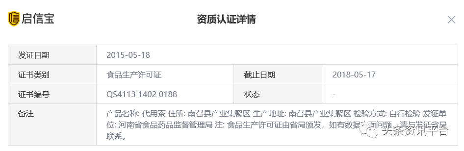 经查启信宝的资质认证页面,我们找到了这款代用茶的食品生产许可证,发证日期是2015年5月18日,截止日期是2018年5月17日。显然,杜仲雄花茶并非保健食品,而是普通的食品而已。