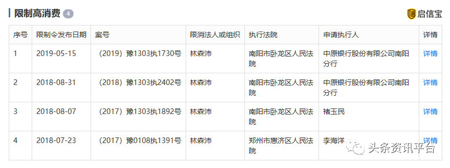 据启信宝显示,该公司在今年4月到8月期间,连续三次被南召县人民法院、南阳市卧龙区人民法院列入被执行人名单。而早在2017年,该公司就有一条由南阳市卧龙区人民法院公示出来的失信信息,同样是在这一年,多次身陷民间借贷纠纷的林森沛等人的股权又被有关部门冻结了三年,冻结期限直到2020年11月。