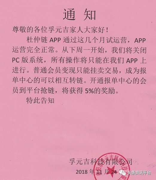 据孚元吉公司的官方微信公众号介绍,公司以杜仲树资源为背书,创立了以区块链技术为基础的数字资产——杜仲链。杜仲链,恒定发行5亿枚,不可增加,不可减少,不可篡改,不可复制,不可模仿。文章还介绍称,“因其资源的稀缺性,加上有强大的杜仲资源做背书,有广大会员的追捧,且在内网只增不减的特性,注定会让会员的财富得到几何级的倍增。”