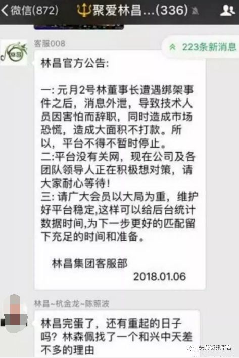 2018年1月6日,林昌药业官方在群里发布公告,这篇公告为了稳住投资人甚至还搬出了“林董事长遭遇绑架事件之后,消息外泄,导致技术人员因害怕而辞职”这种让人哭笑不得的借口。