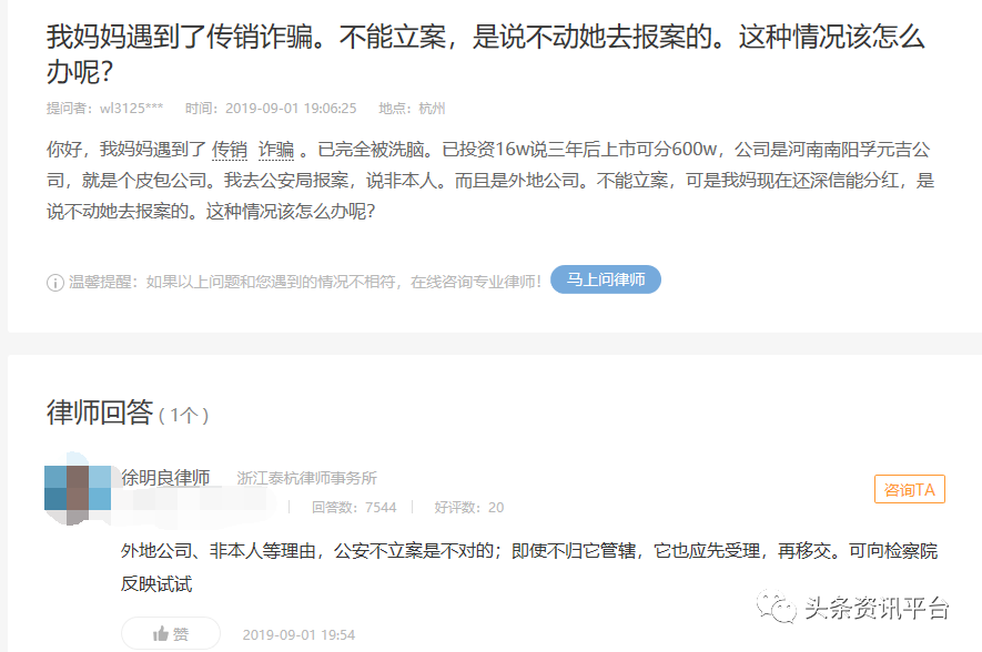 在找法网上,有网友反映,“我妈妈遇到了传销诈骗,已完全被洗脑。已投资16万,说三年后上市可分600万元,公司是河南南阳孚元吉公司,就是个皮包公司。”
