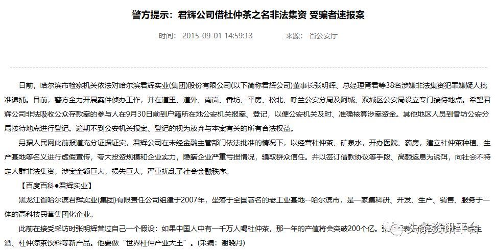 近年来,以养生保健为名行集资诈骗之实的企业越来越多。在杜仲产业领域,早年间借杜仲茶之名进行非法集资的哈尔滨君辉实业(集团)股份有限公司可以算做是南阳孚元吉的前车之鉴。