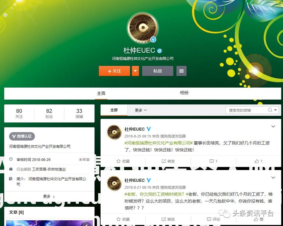 南阳市孚元吉网络科技有限公司成立于2018年1月10日,法定代表人李卫军,注册资本3000万元,实缴3000万元(实缴出资时间为2028年1月11日,实缴出资方式为货币、实物、知识产权、债权、土地使用权、其他),主要产品有杜仲树皮、杜仲泡足粉、杜仲雄花茶、杜仲籽油、杜仲软胶囊等。虽然公司销售的是与杜仲行业相关的产品,但据启信宝显示,该公司的所属行业却是“机动车、电子产品和日用产品修理业”。